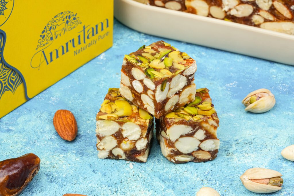 A rich blend of Dates, Honey, Almonds, Cashews, and Pistachios — crafted in A2 Gir Cow Ghee for a healthy, guilt-free treat. Perfect for festivals, fasting, or everyday indulgence. Made fresh with 100% natural ingredients.