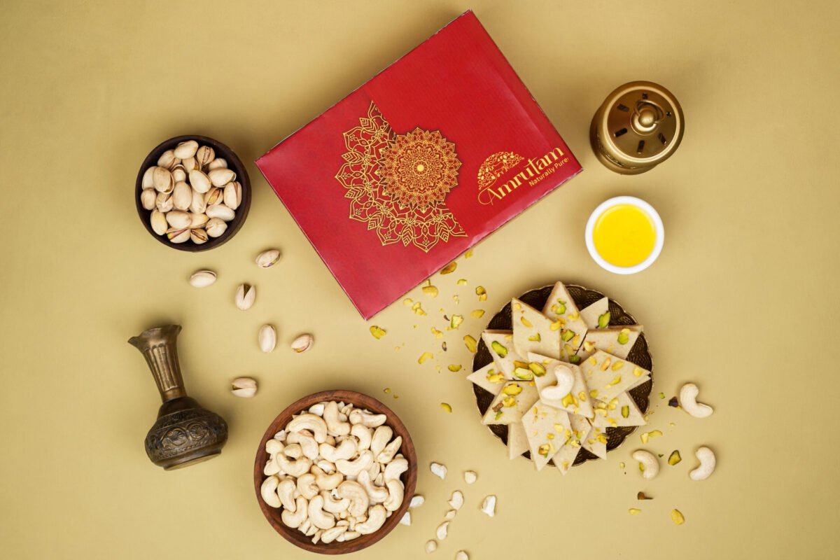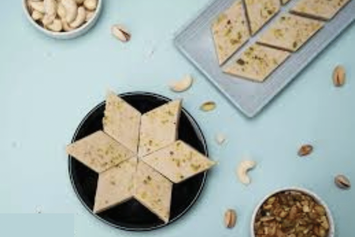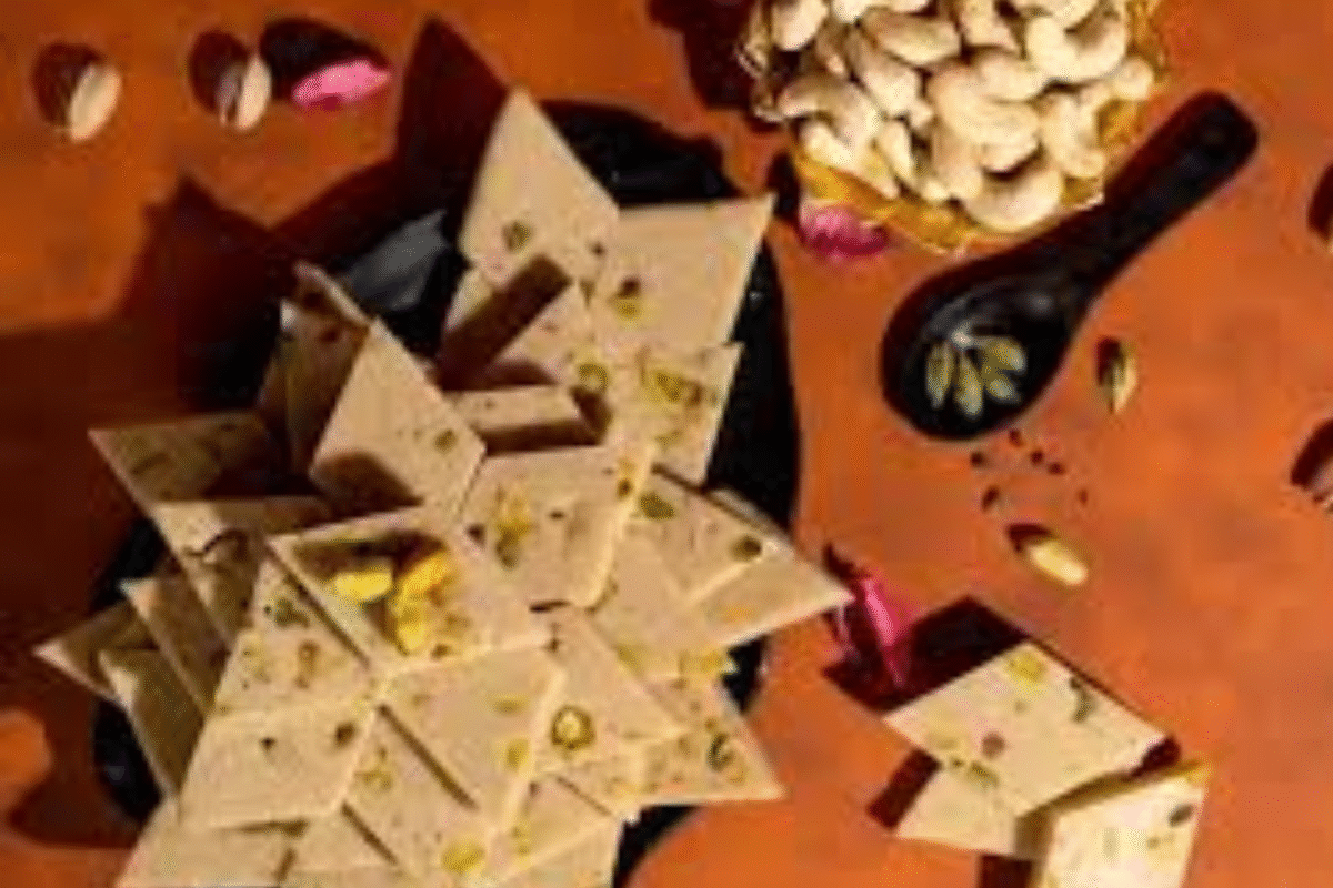 Traditional Indian sweet made with just Cashew, Sugar, and Pistachio — no warakh (silver foil), no mawa.